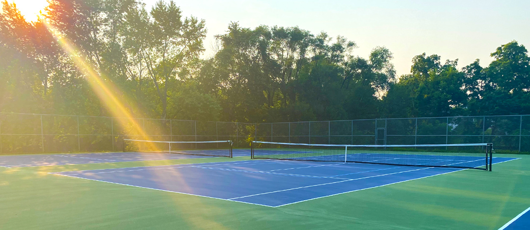 Our fenced-in court area includes three courts, a basketball hoop, and a tennis hitting board. Designed for multiple sports, the courts are marked for tennis and pickleball, with one court also adaptable for volleyball or badminton. Summer lessons and group events in tennis and pickleball provide great opportunities for fun and skill-building.